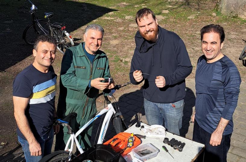 Diesen Samstag schulten wir geflüchtete Ehrenamtliche in der Fahrradreparatur. Besonders im Bereich der Ketten- und Nabenschaltungen gab es noch offene Fragen, die während des Kurses geklärt wurden. Mit großem Engagement nahmen Resa Iran, Acar Yasar und Vahid Karkhaneh (siehe Foto, P.v.li.n.re.) an der Schulung teil. Sie unterstützen das IFM regelmäßig und zuverlässig in der Internationalen Fahrradwerkstatt. Der gelernte Feinmechaniker Simon Basten (3. P. v.li.) freute sich, sein Wissen an die ehrenamtlichen Helfer weitergeben zu können.