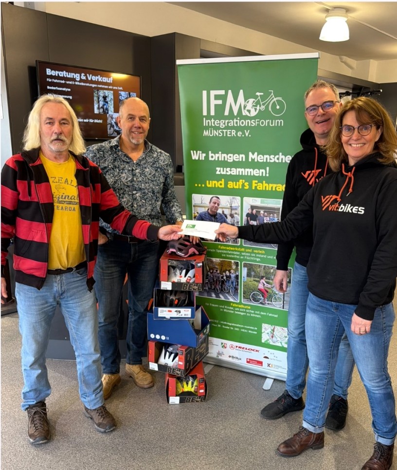 Am 3.2.2026 trafen sich für ein großes Dankeschön und Überreichung der Spendendokumente der IFM (Kassenwart Dirk Hache und Schrauber Volker Bockskopf) und die Geschäftsführung von 2Rad-Weigang (Georg und Anja Weigang) im Hauptgeschäft an der Grevener Straße. Bei einem entspannten Termin und einem guten Kaffee berichtete das Ehepaar Weigang über Motivation und „Liegenbleiber“ im Lager: